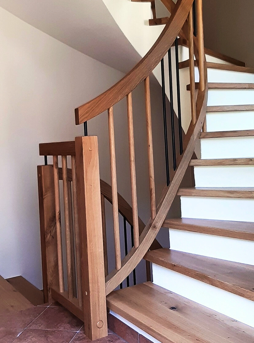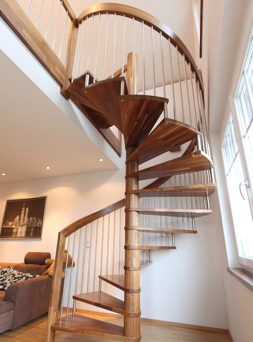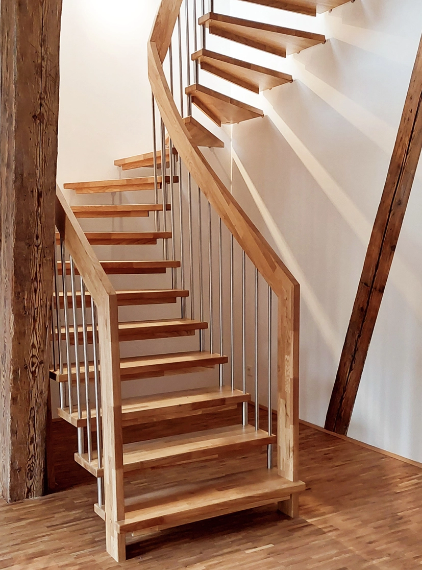 Sparen Sie wertvollen Platz mit einer elegant geschwungenen Stiege, die sich ideal für kleine Räume oder als zusätzlicher Zugang eignet.