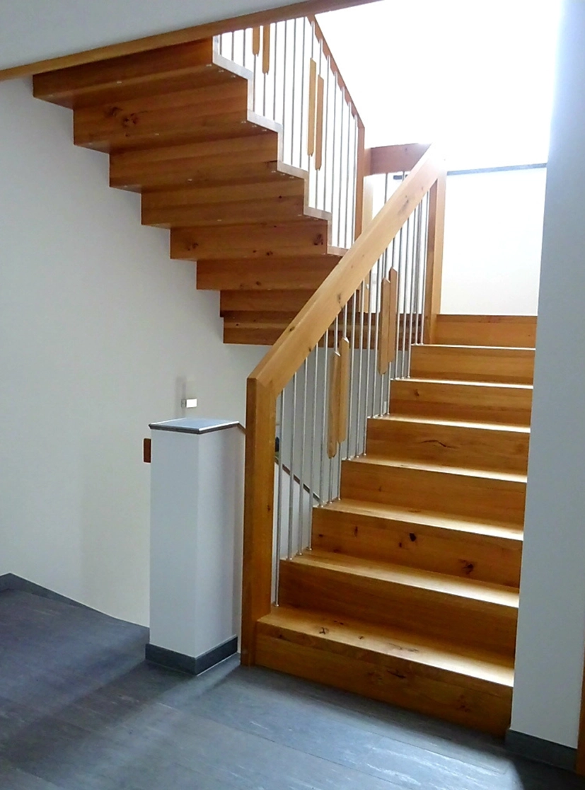Veredeln Sie Betonkerne mit passgenauen Holzstufen und verleihen Sie Aufgängen durch individuelle Geländerlösungen eine wohnliche Atmosphäre.