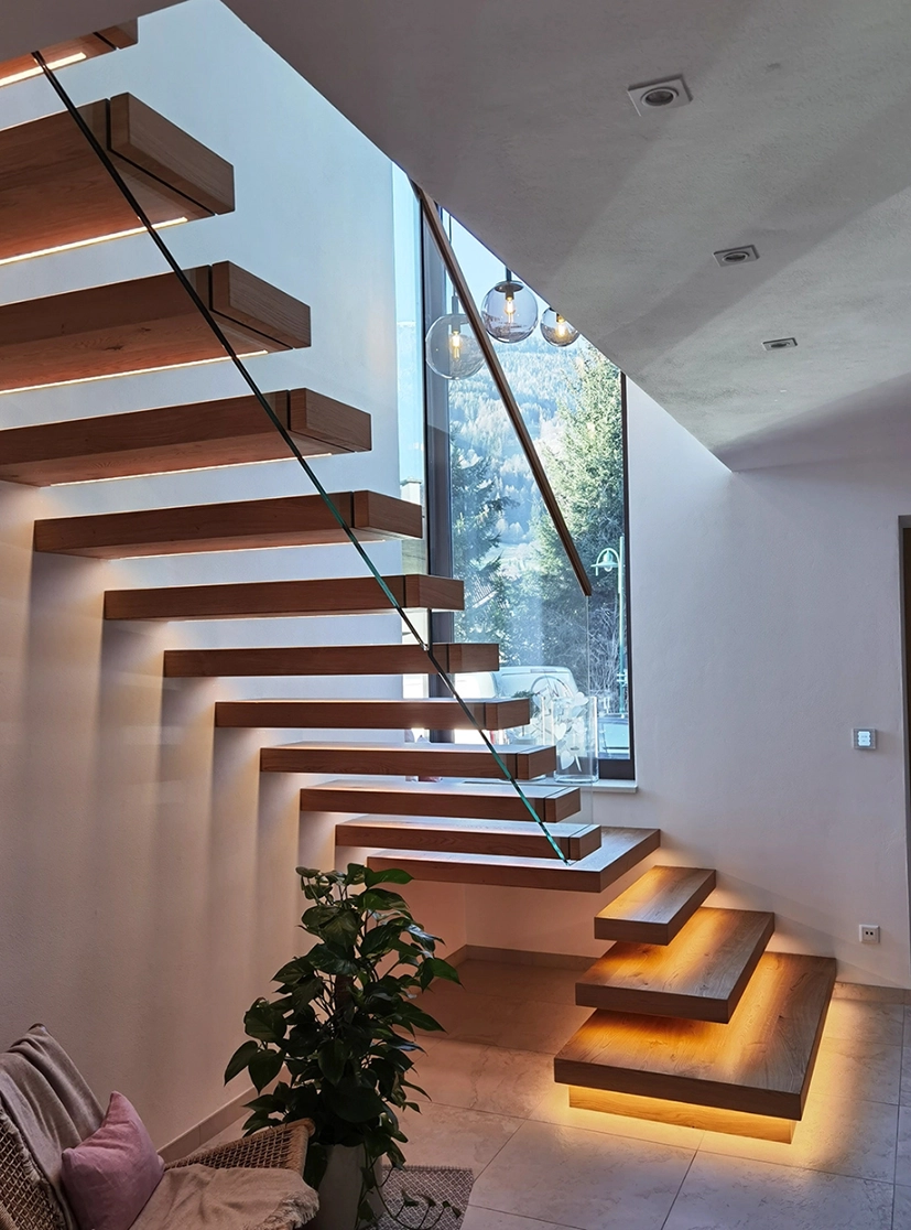 Setzen Sie auf ein modernes Highlight mit Stufen, die scheinbar frei aus der Wand ragen und Ihrem Raum eine beeindruckende Leichtigkeit verleihen.