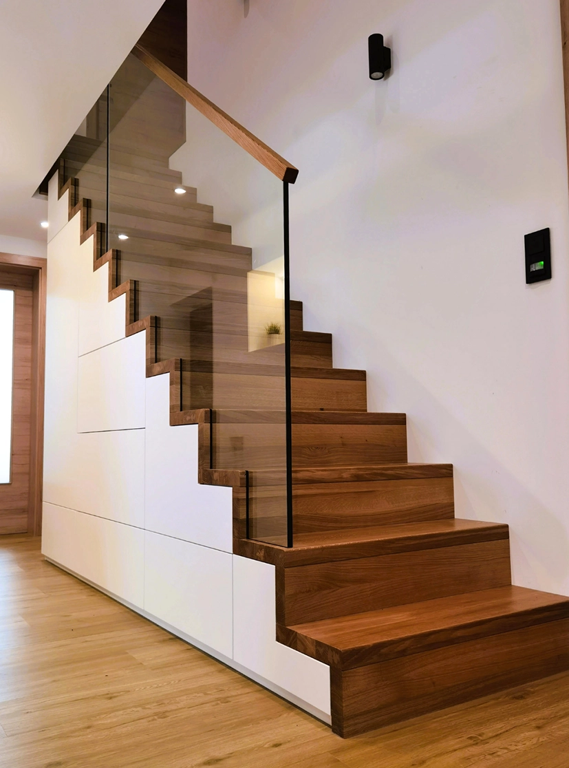 Verwandeln Sie ungenutzte Nischen in wertvollen Platz durch maßgefertigte Schranklösungen, die sich nahtlos und diskret in Ihr Treppendesign integrieren.